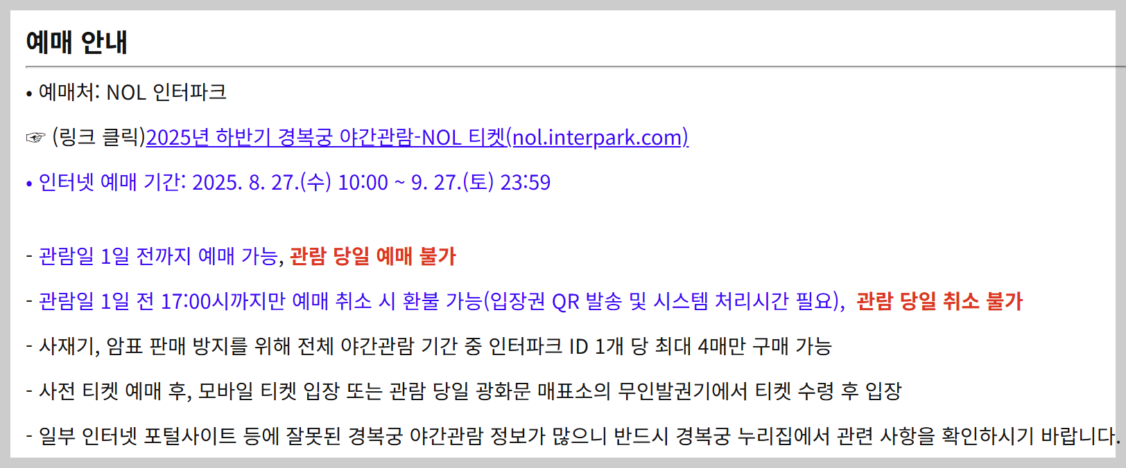 경복궁 야간개장은 사전 예매가 필수입니다. 입장 인원이 제한되어 있어 예매 시작과 동시에 매진되는 경우가 많으니 예매 시간 정각에 접속하는 게 중요합니다.