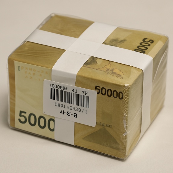이렇게 포장된 관봉권은 외부에서 손을 댄 흔적 없이 완전히 밀봉된 상태로 보관됩니다. 비닐 포장에 십자 띠까지 둘러져 있어서, 육안으로도 ‘개봉되지 않았음’을 쉽게 확인할 수 있어요.