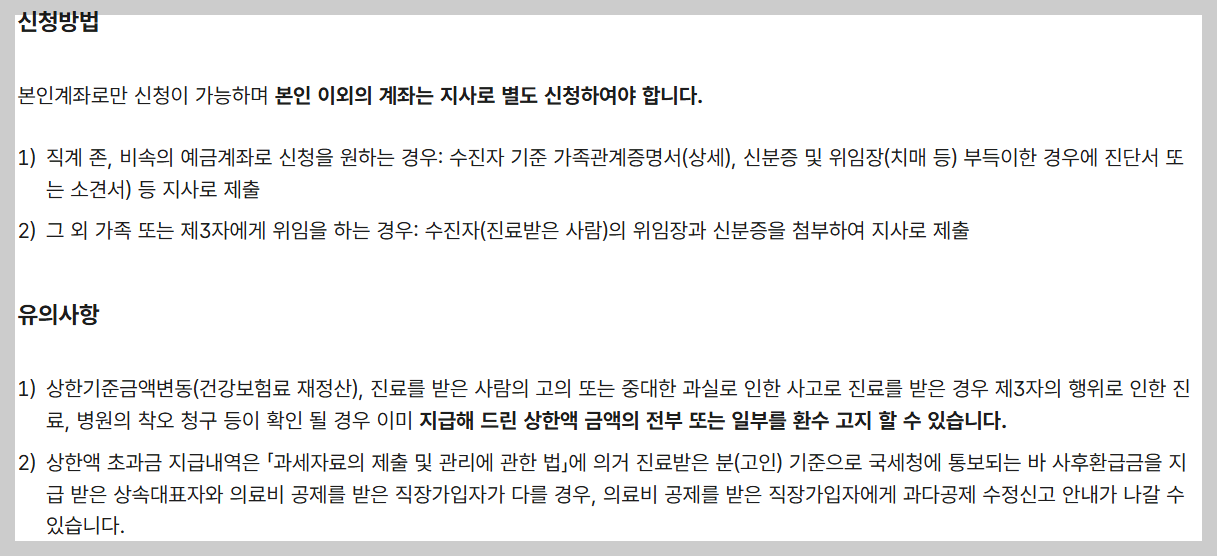 - 사전급여: 한 병원에서 병원비가 상한액을 넘는 경우, 환자가 초과분을 내지 않고 병원이 건강보험공단에 직접 청구하는 방식이에요.