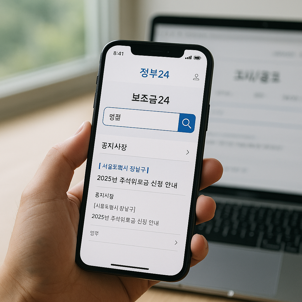 - 정부24(보조금24), 복지로 접속 → 상단 검색창에 ‘명절’, ‘지원금’ 입력 → 우리 지역 이름 포함된 공지 확인