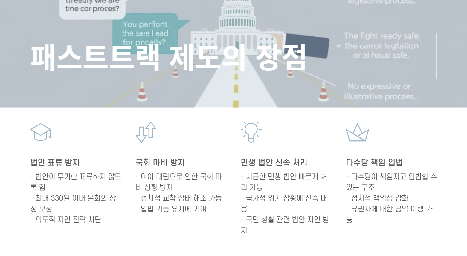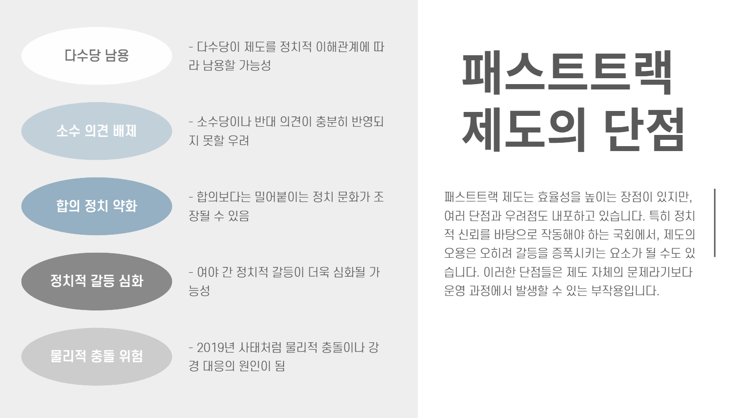 - 다수당이 패스트트랙을 남용할 경우, 소수 의견이 배제될 수 있음